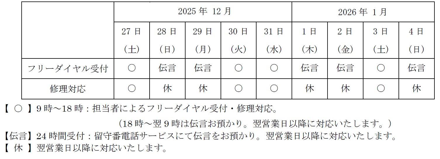 年末年始 フリーダイヤル受付・修理対応のご案内